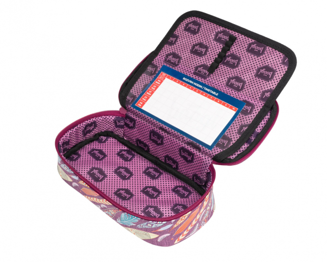 Fialový dívčí penál na zip s dvojitou výklopnou chlopní a potiskem pírek.