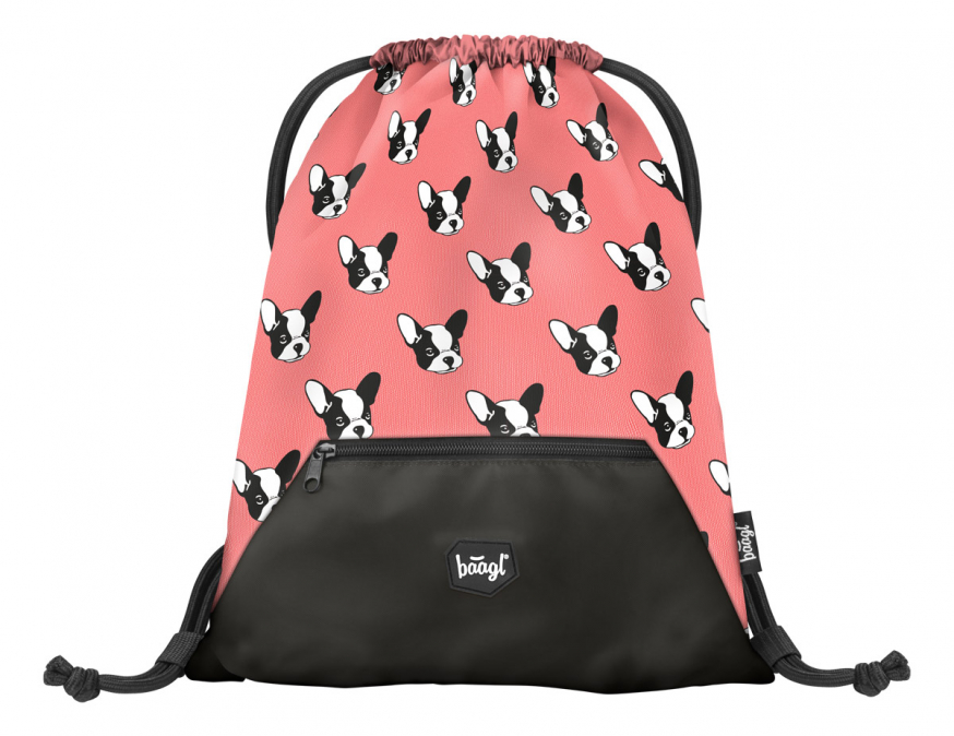 Světle červený sáček na cvičky nebo přezůvky s motivem pejska na přední straně.