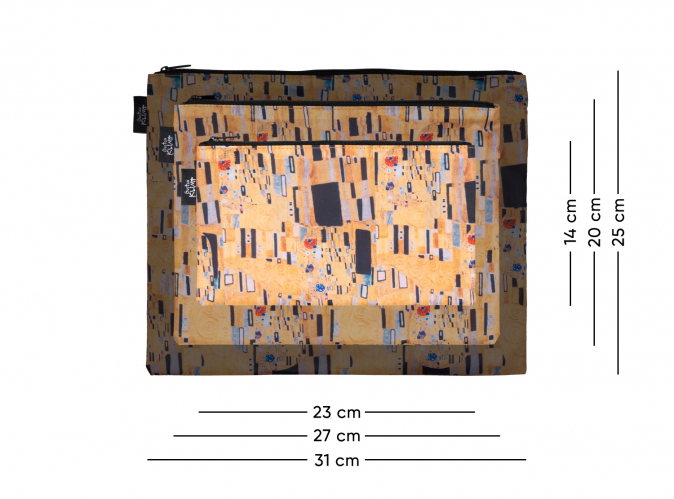 Kam uklidit kartáček, zubní pastu nebo rtěnku? Jak v kufru oddělit ponožky a spodní prádlo? Mít hned po ruce doklady a další potřebné dokumenty? Máme pro vás skvělé řešení! Díky těmto praktickým a stylovým taštičkám na zip ve třech velikostech máte vše pohodlně a rychle po ruce. Taštičky jsou potištěné klasickým dílem Gustava Klimta.