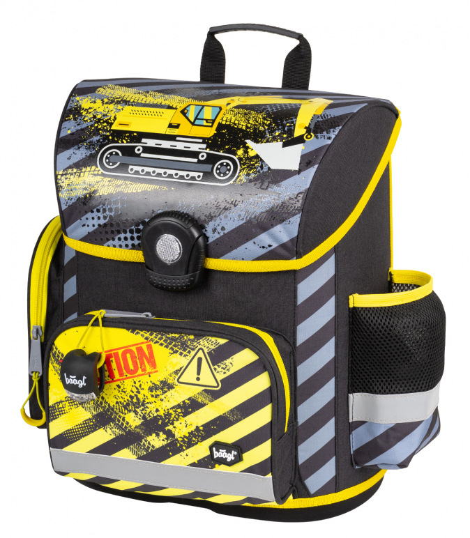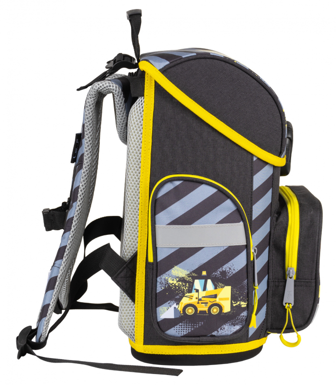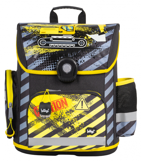 Školní aktovka s obrázkem bagru na přední části, vhodná pro žáky 1.–2. třídy ZŠ. Aktovka byla úspěšně testována v ITC Zlín.