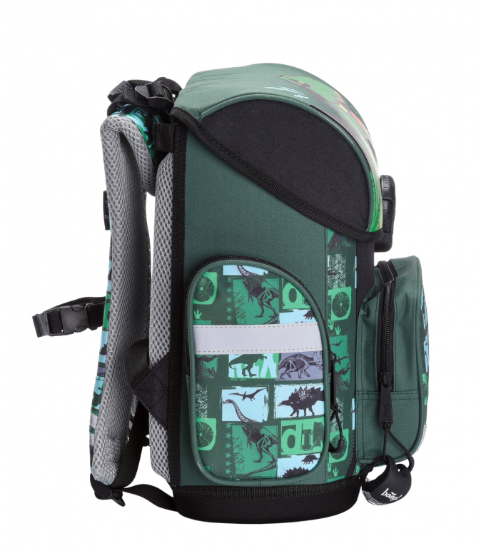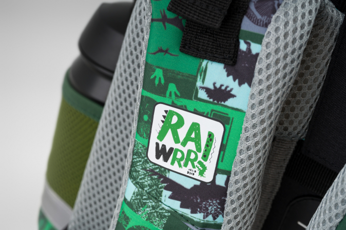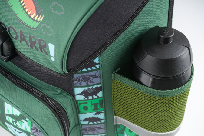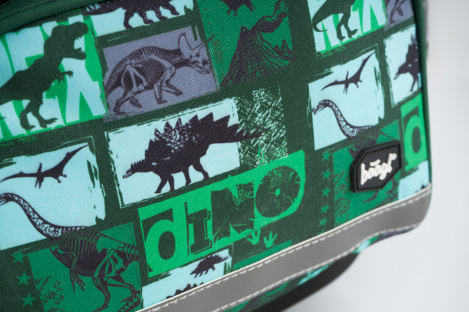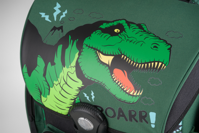 Školní aktovka s motivem dinosaura na přední části, vhodná pro žáky 1.–2. třídy ZŠ. Aktovka byla úspěšně testována v ITC Zlín.
