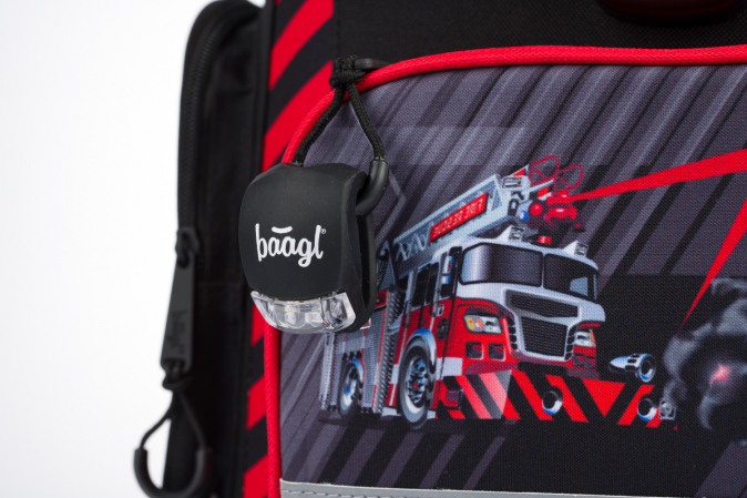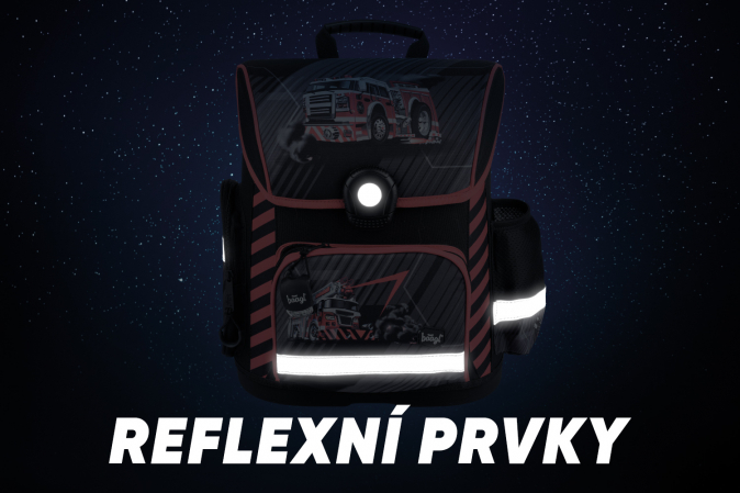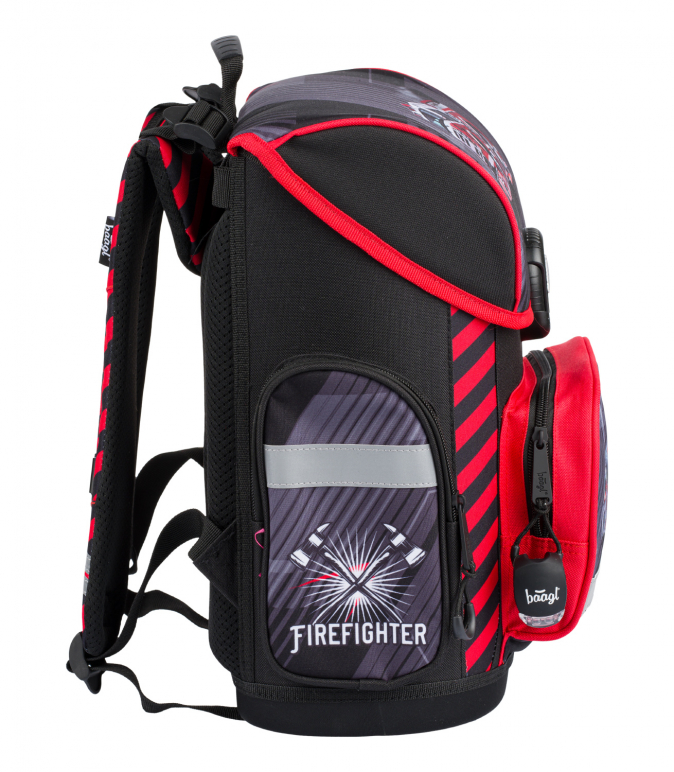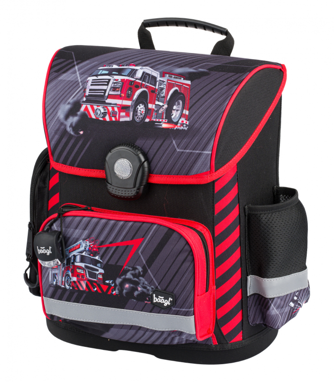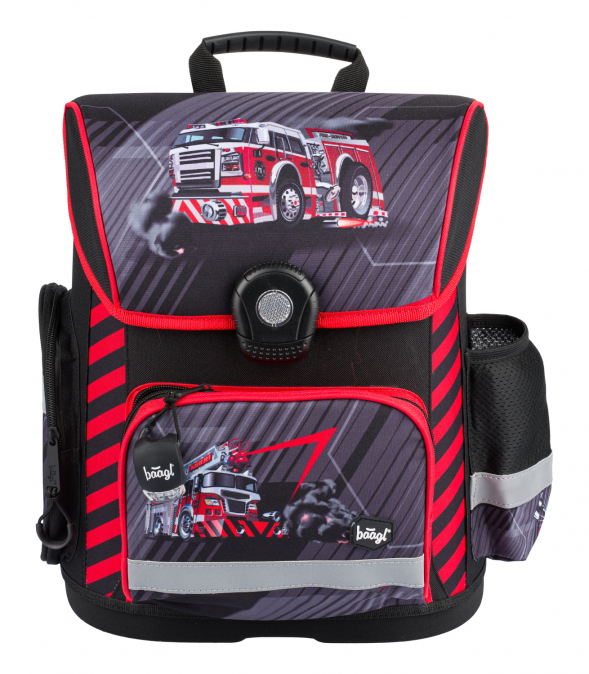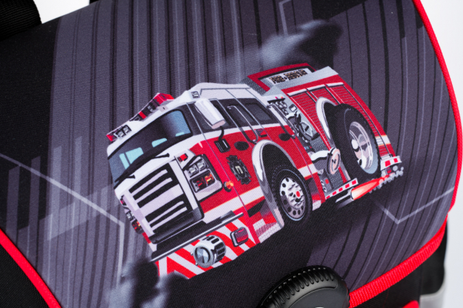 Klučičí školní aktovka v černé barvě s červenými detaily a obrázkem hasičského auta. Tato aktovka je vhodná od 1. třídy základní školy.