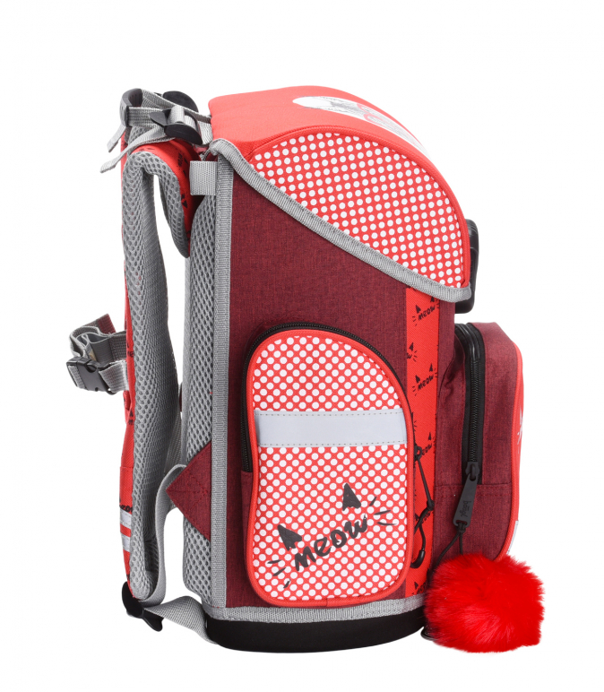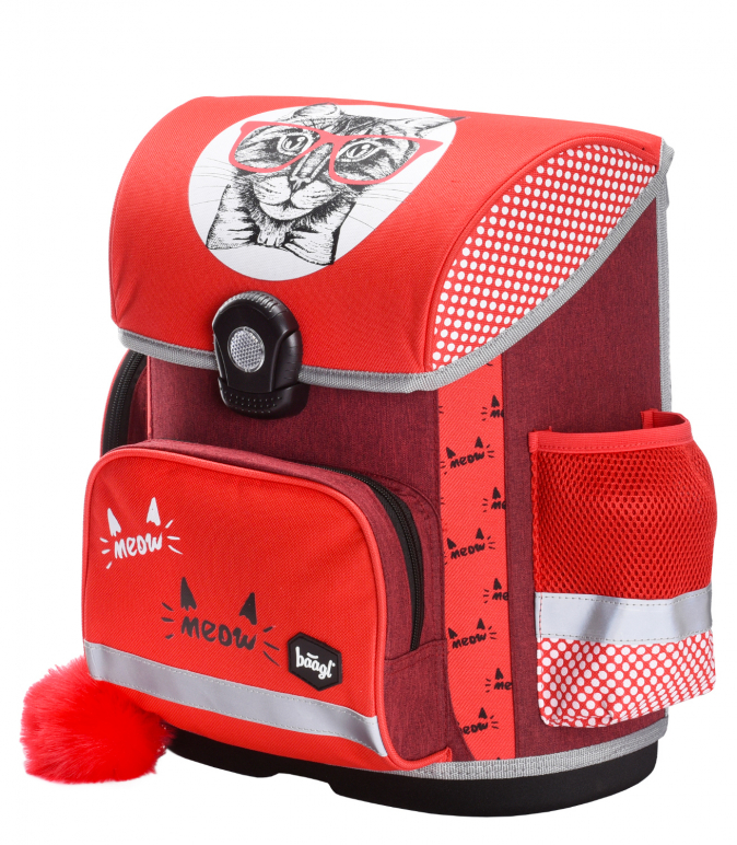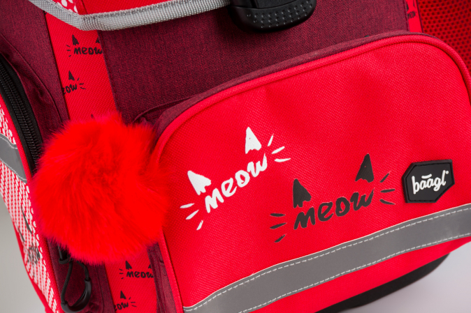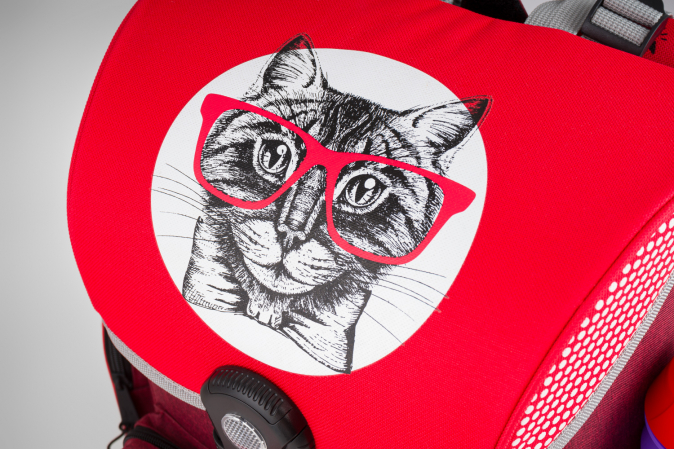 Školní aktovka s motivem kočky na přední části, vhodná pro žáky 1.–2. třídy ZŠ. Aktovka byla úspěšně testována v ITC Zlín.