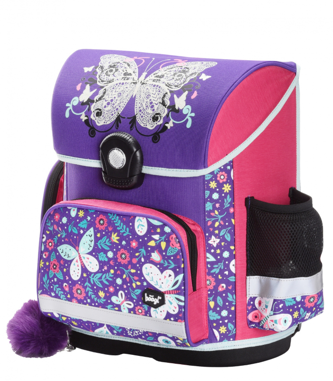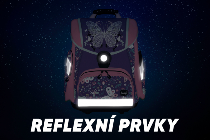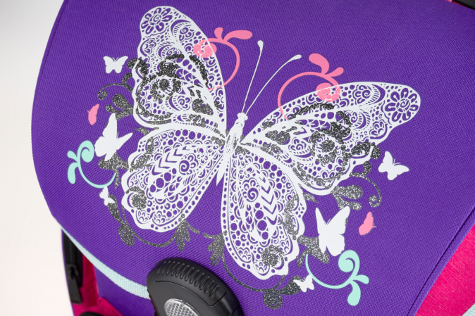 Školní aktovka s motivem motýla na přední části, vhodná pro žáky 1.–2. třídy ZŠ. Aktovka byla úspěšně testována v ITC Zlín.