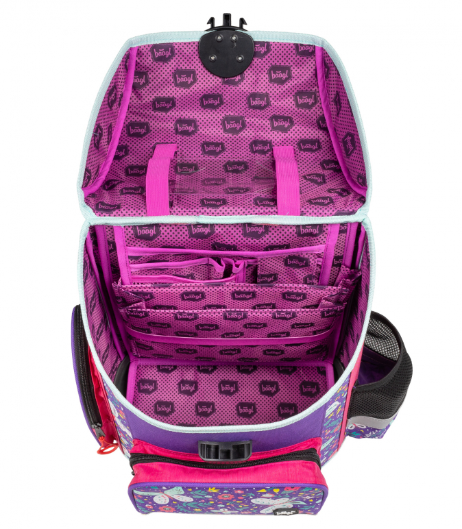 • Uvnitř aktovky je průhledná kapsa s rozvrhem a vnitřní organizér umožňující rovnoměrné rozložení hmotnosti.