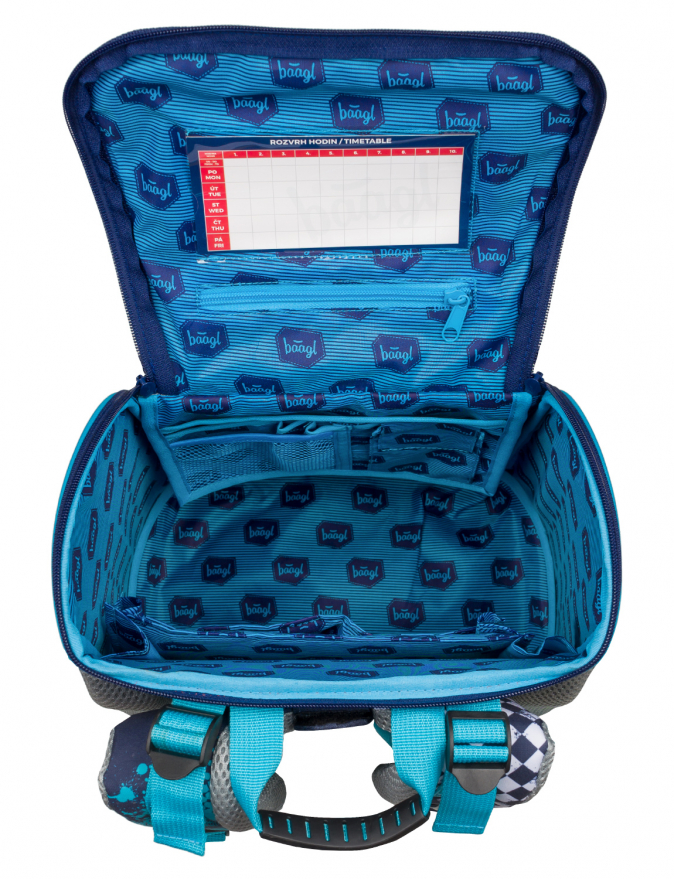 • Uvnitř aktovky je průhledná kapsa s rozvrhem a vnitřní organizér umožňující rovnoměrné rozložení hmotnosti, doplněný gumičkou pro fixaci.