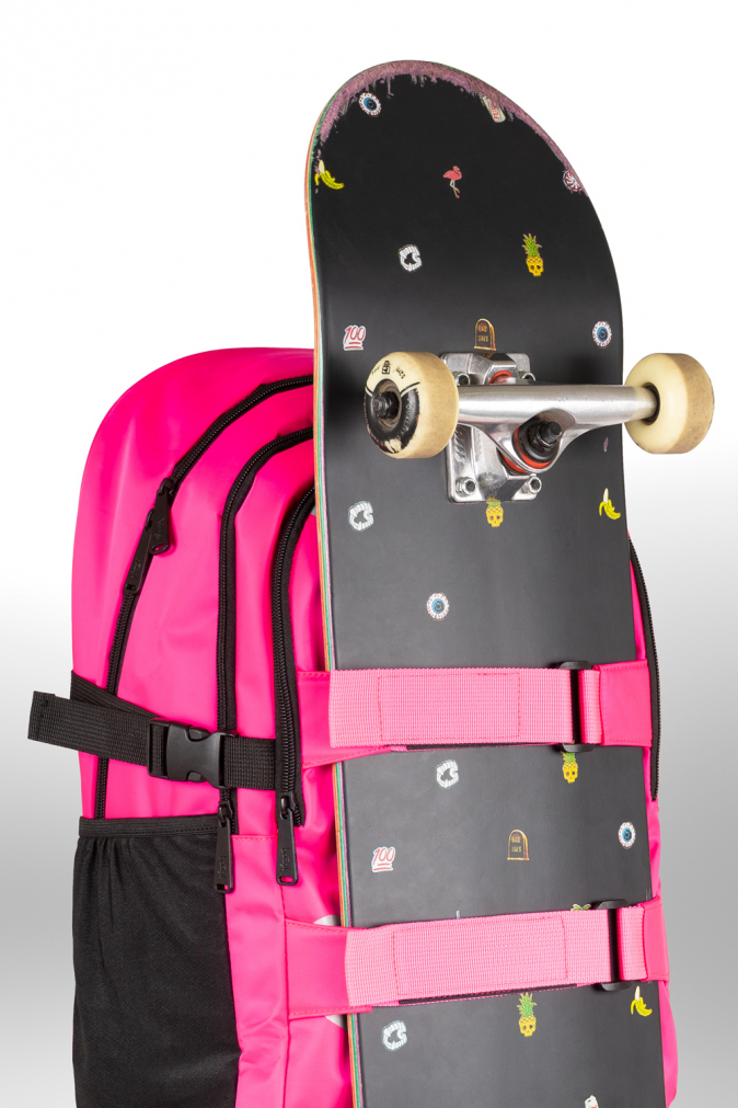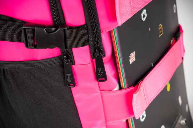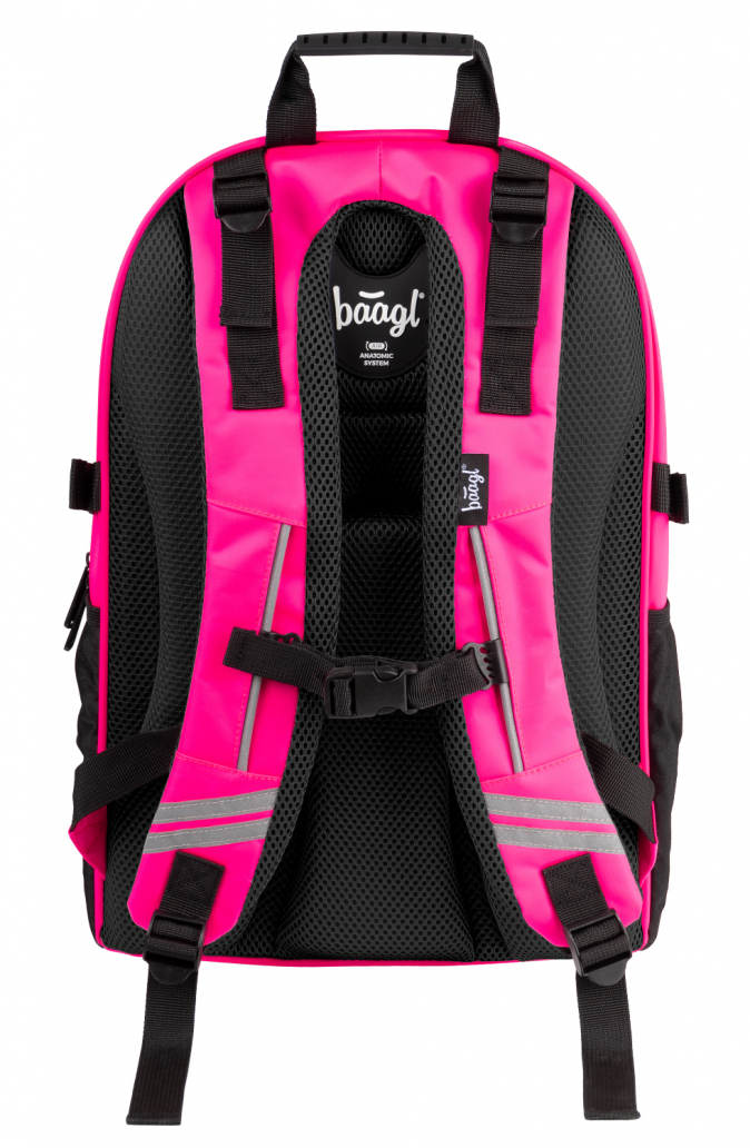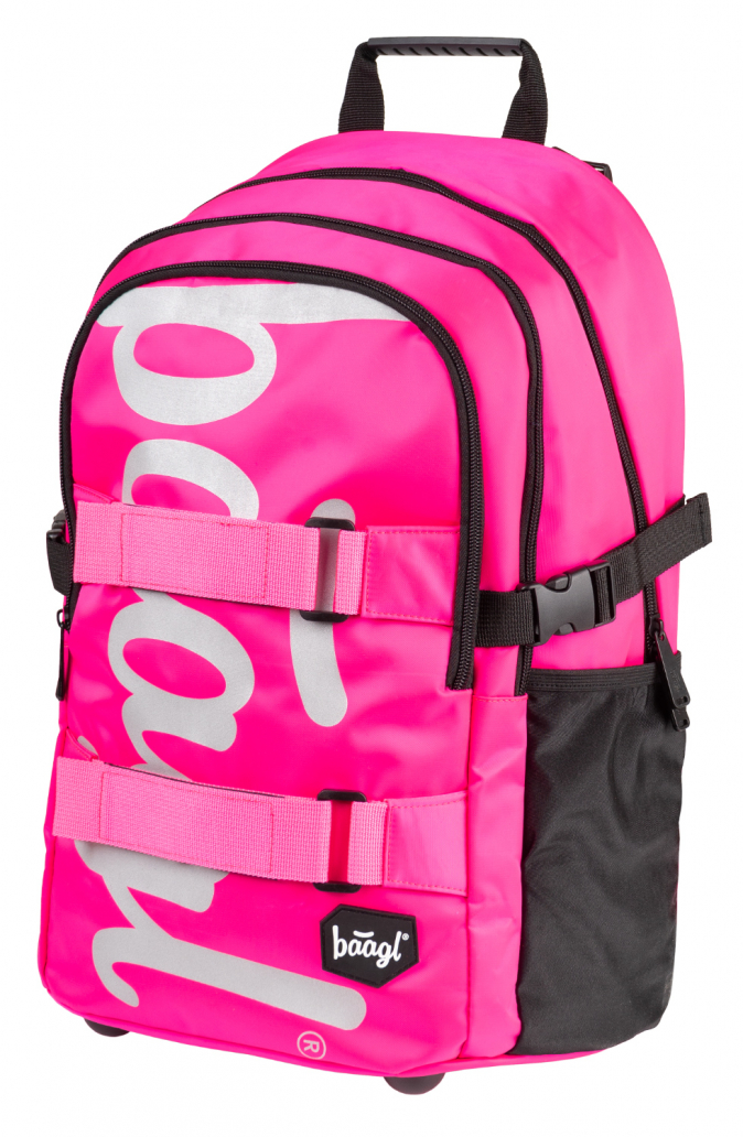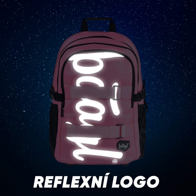 Školní batoh Skate Pink s reflexním logem Baagl na přední straně, vhodný od 3. třídy 1. stupně ZŠ a také pro 2. stupeň ZŠ. Batoh byl úspěšně testován v ITC Zlín.