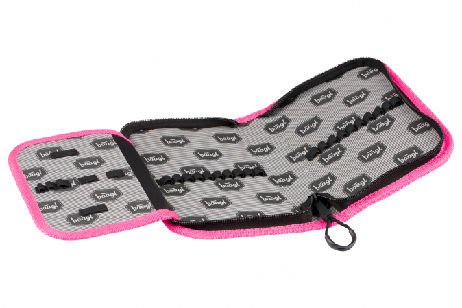 Klasický školní penál v zelené barvě s výrazně růžovými detaily.
