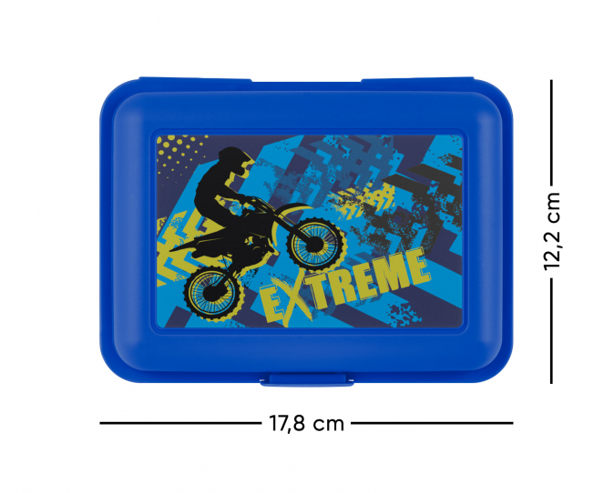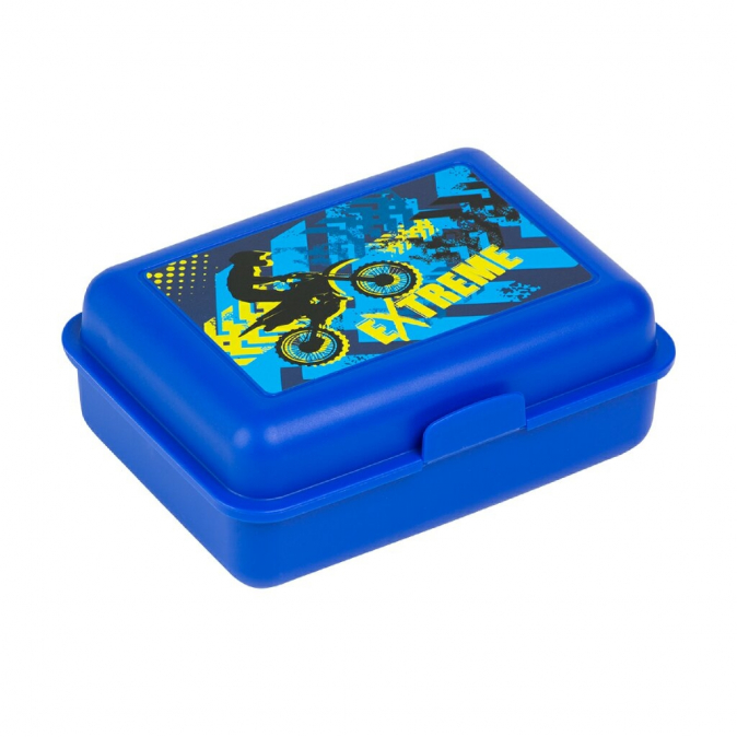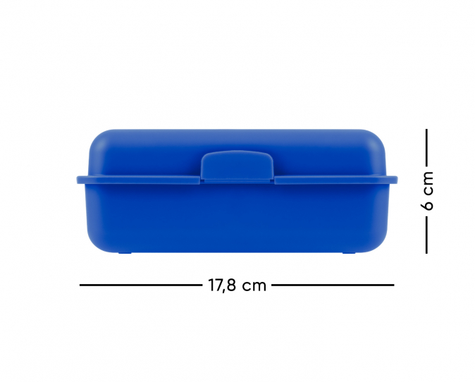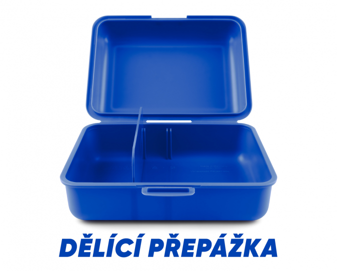 Modrý chlapecký plastový box na svačinu s uzavíráním na jeden zámek a dělící přepážkou.