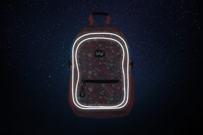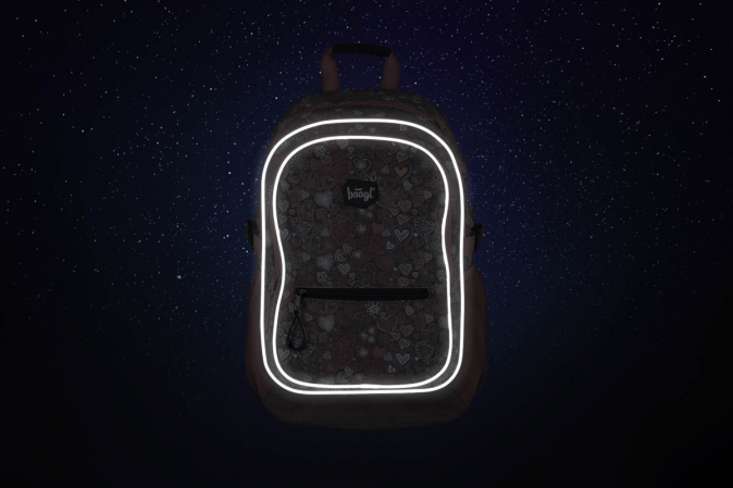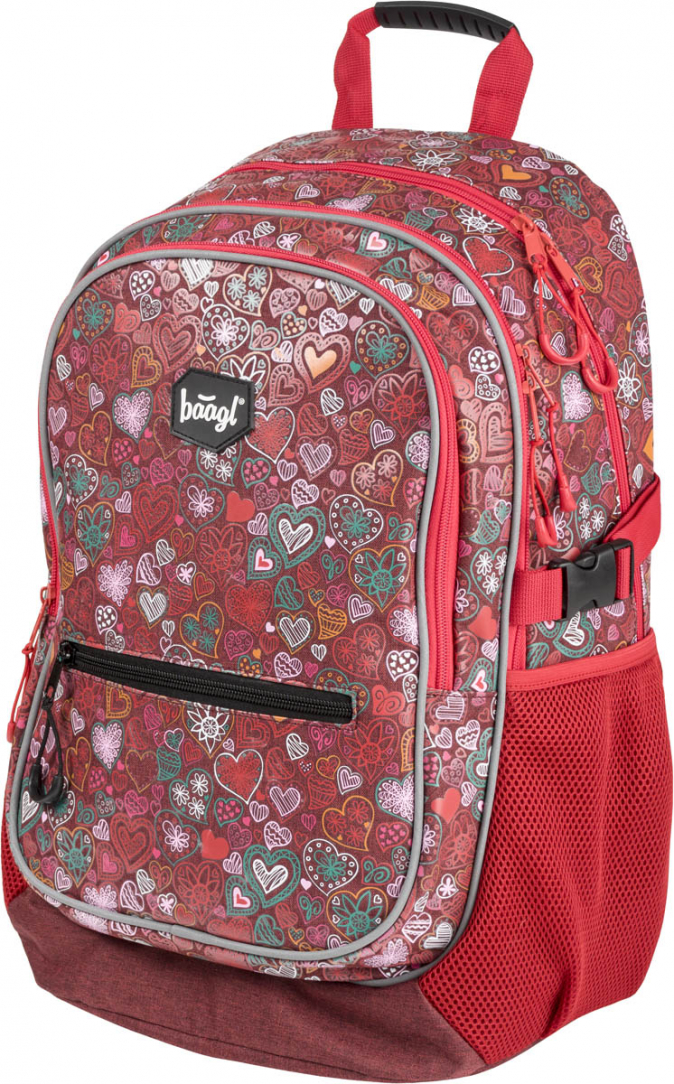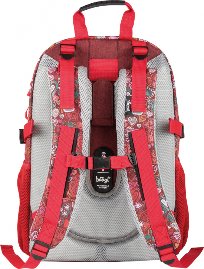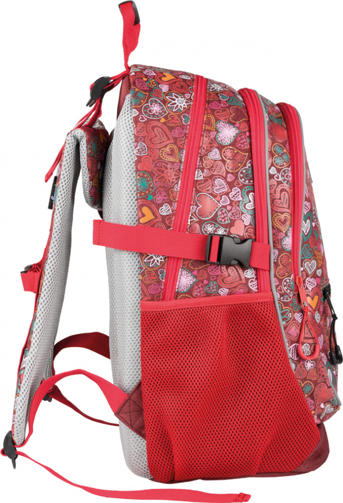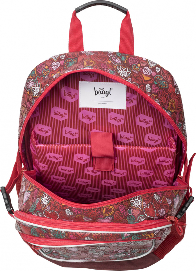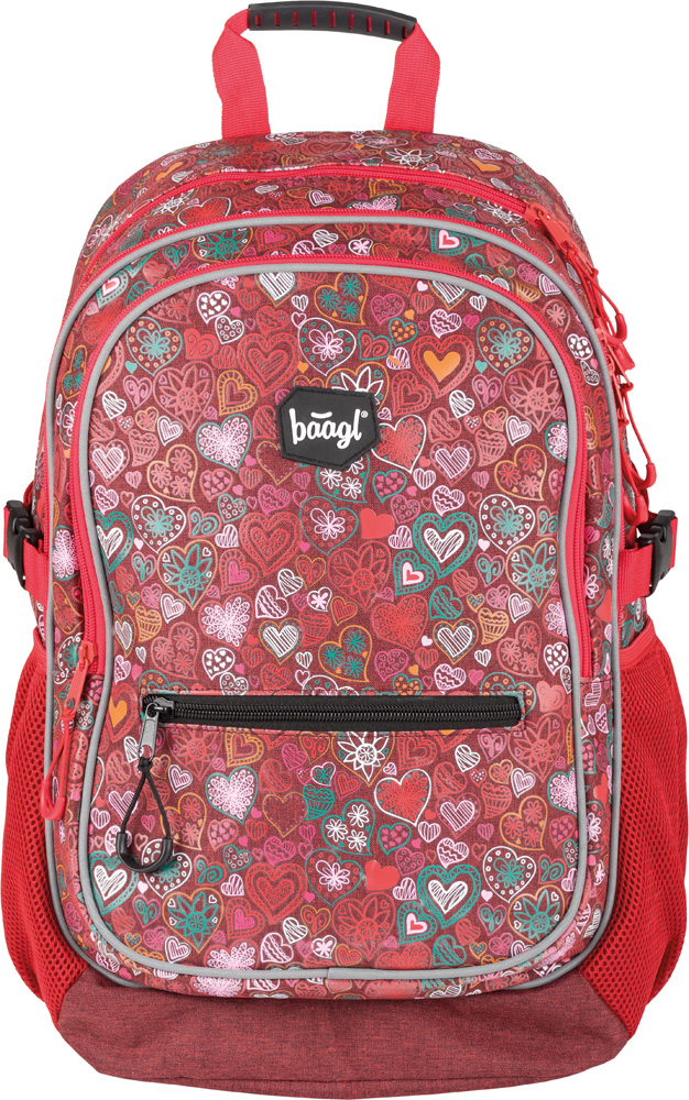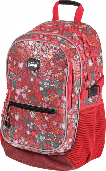 Školní batoh s motivem srdcí v dívčím provedení, vhodný od 3. třídy 1. stupně ZŠ a také pro 2. stupeň ZŠ. Batoh byl úspěšně testován v ITC Zlín.